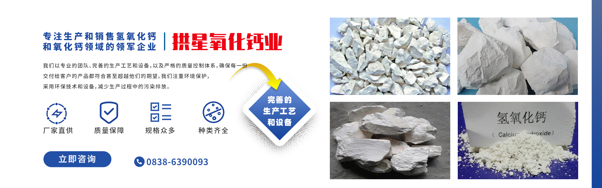 綿竹市拱星氧化鈣業(yè)有限公司是一家在生產(chǎn)和銷(xiāo)售氧化鈣領(lǐng)域的領(lǐng)軍企業(yè),成立于1998年,始終致力于提供高質(zhì)量的產(chǎn)品。公司的主要產(chǎn)品包括氫氧化鈣和氧化鈣,這些產(chǎn)品廣泛應(yīng)用于農(nóng)業(yè)、建筑、塑料和橡膠工業(yè)等領(lǐng)域。 我們以專(zhuān)業(yè)的團(tuán)隊(duì)、先進(jìn)的生產(chǎn)工藝和設(shè)備,以及嚴(yán)格的質(zhì)量控制體系,確保每一份交付給客戶(hù)的產(chǎn)品都符合甚至超越他們的期望。我們注重環(huán)境保護(hù),采用環(huán)保技術(shù)和設(shè)備,減少生產(chǎn)過(guò)程中的污染排放。 ...